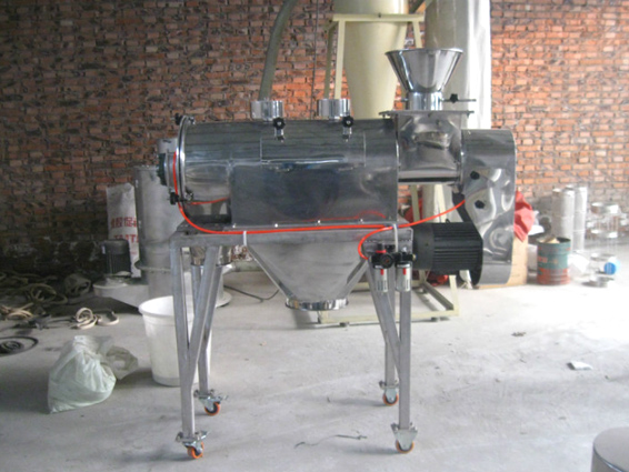卧式气流筛由于形状为横卧状所以也叫卧式气流筛或卧式气流筛,网为圆筒状,置于机体内,物料通过螺旋输送系统后,和气流混合、雾化进入网筒内;通过网筒内风轮叶片使物料同时受离心力和旋风推进力,从而近使物料喷射过网,由细料排出口排出,不能过网的物料沿网筒壁从粗料排出口排出。